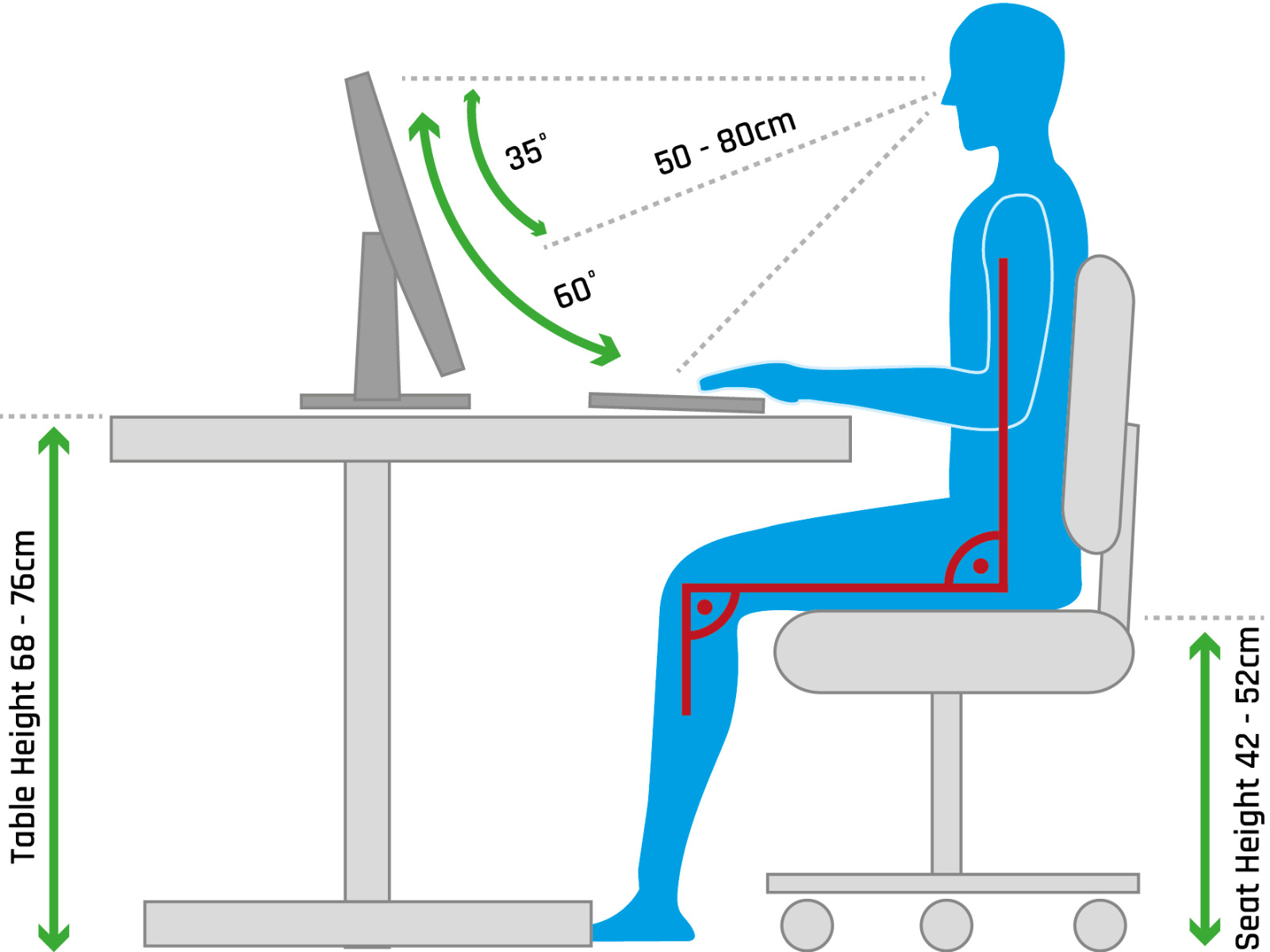 • The line of sight should be straight to avoid neck twisting; a slight backward tilt of the screen helps maintain a natural head position.
